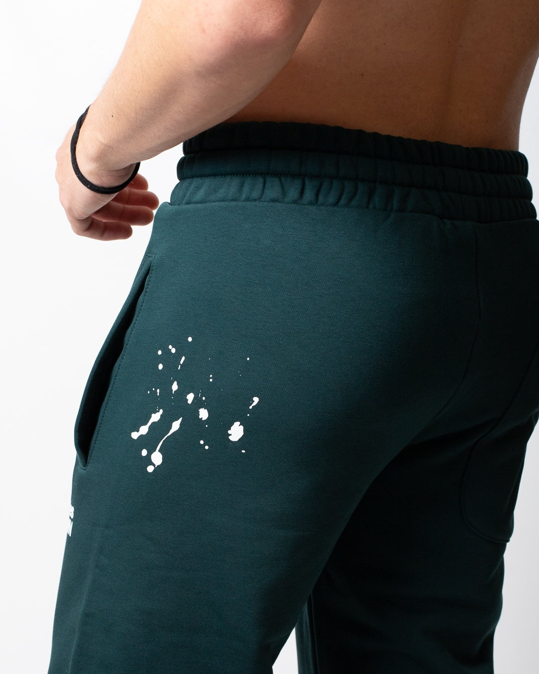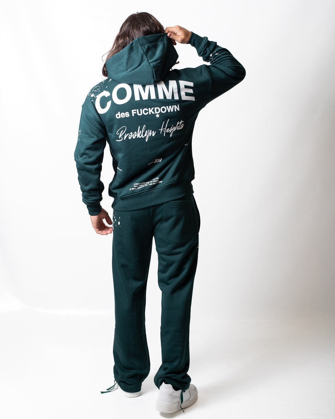 Pantalone Comme des Fuckdown verde, unica variante. Design in felpa, vita elasticizzata con coulisse di regolazione, tasche laterali, tasca sul retro, coulisse di regolazione alle caviglie, nervature applicate frontalmente, stampe applicate a contrasto e logo stampato a contrasto sul davanti.