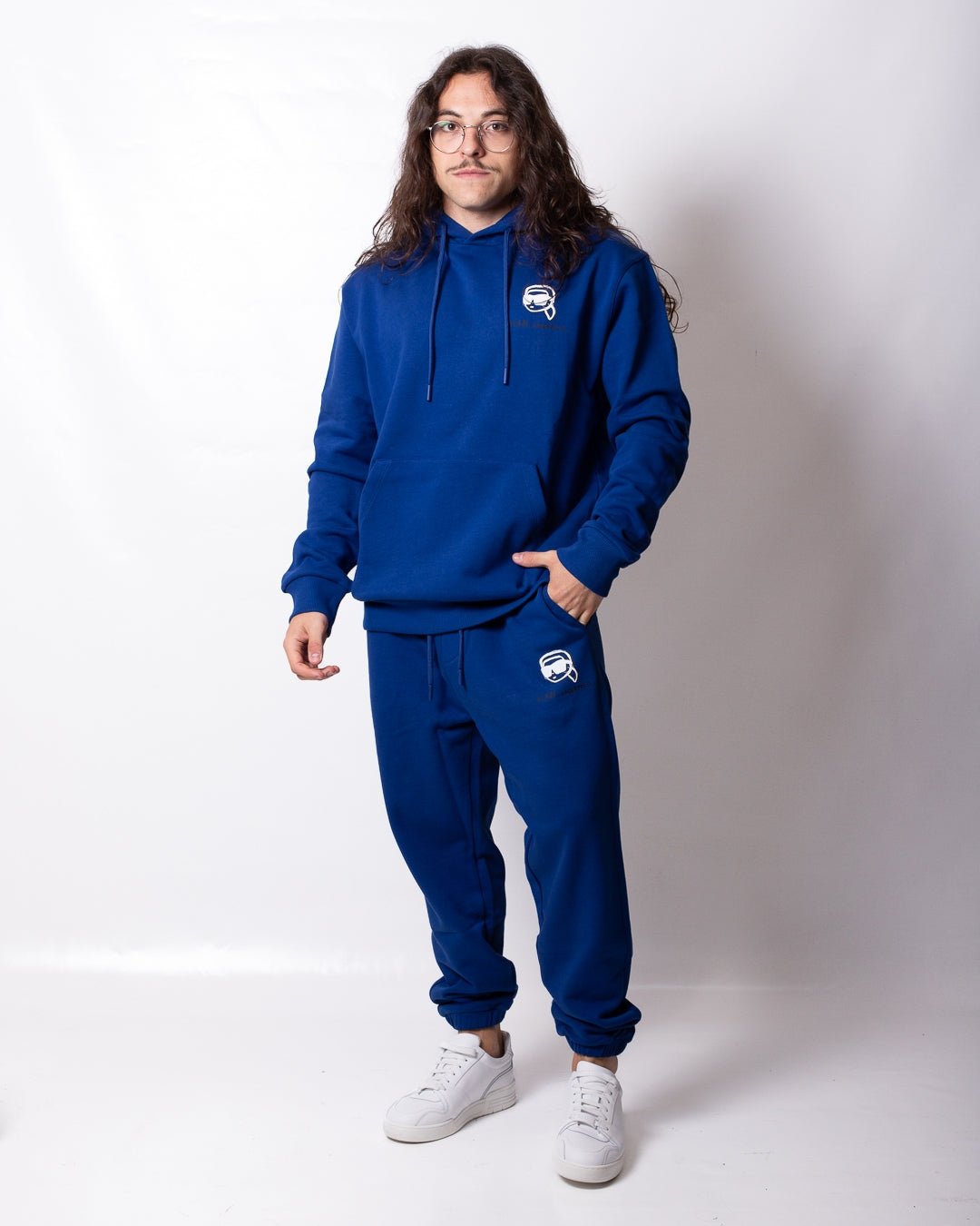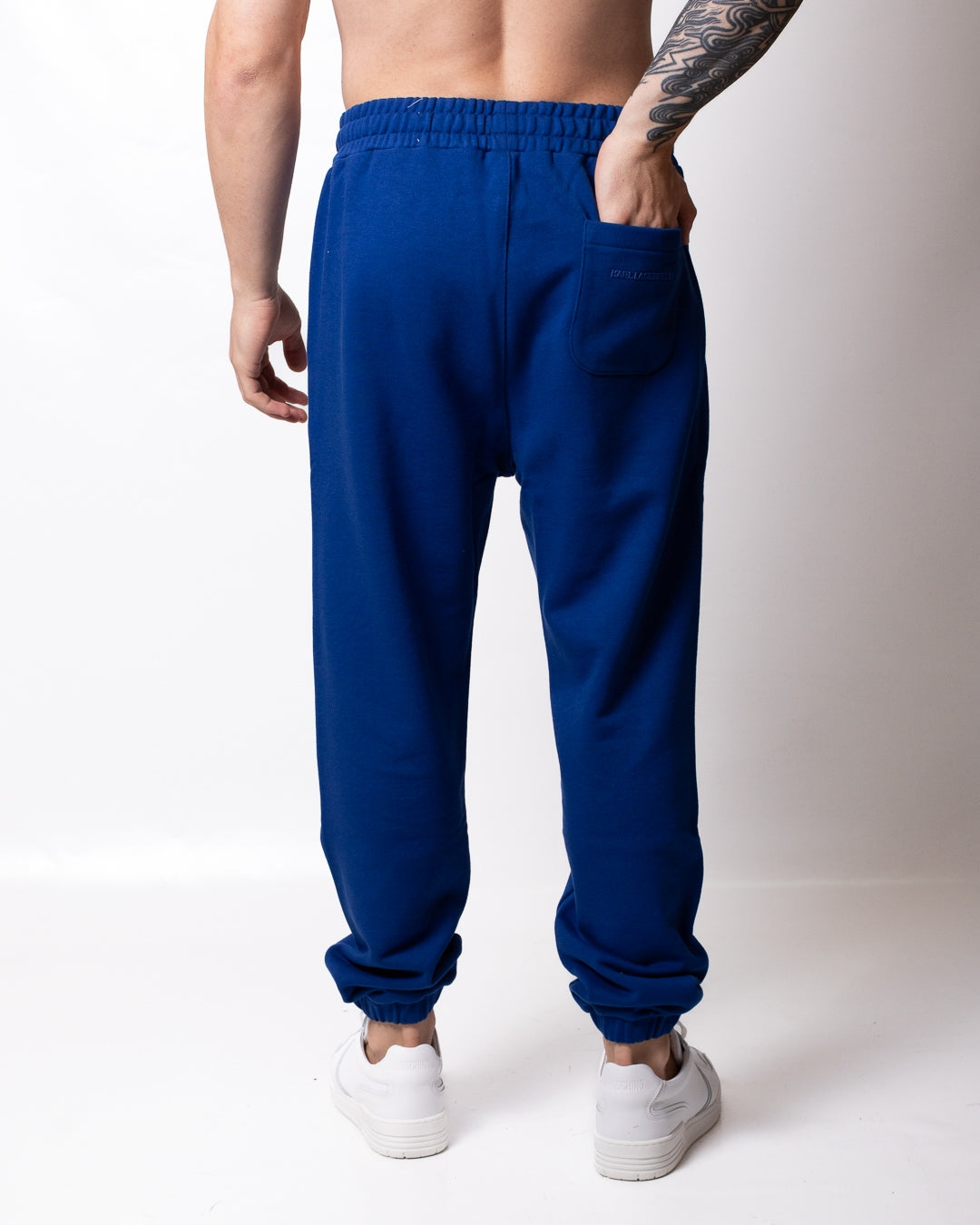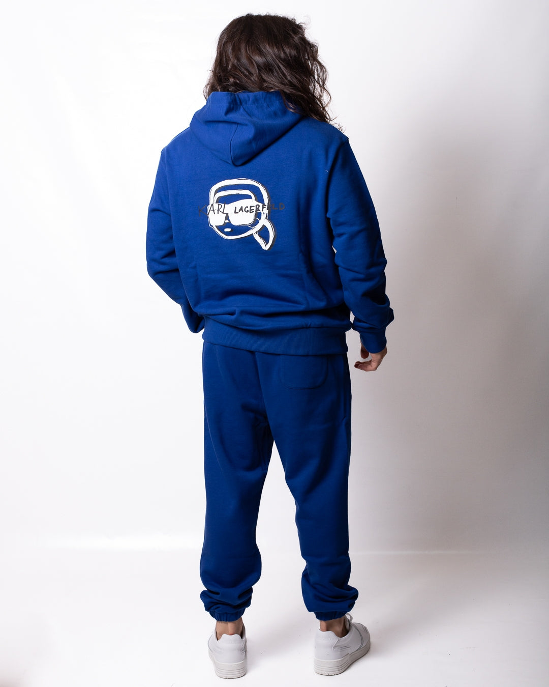 Pantalone Karl Lagerfeld blu, unica variante. Design in felpa, vita elasticizzata con coulisse di regolazione, tasche laterali, tasca sul retro, caviglie elasticizzate, stampa Karl logata applicata sul davanti e logo applicato in rilievo tono su tono sul retro.