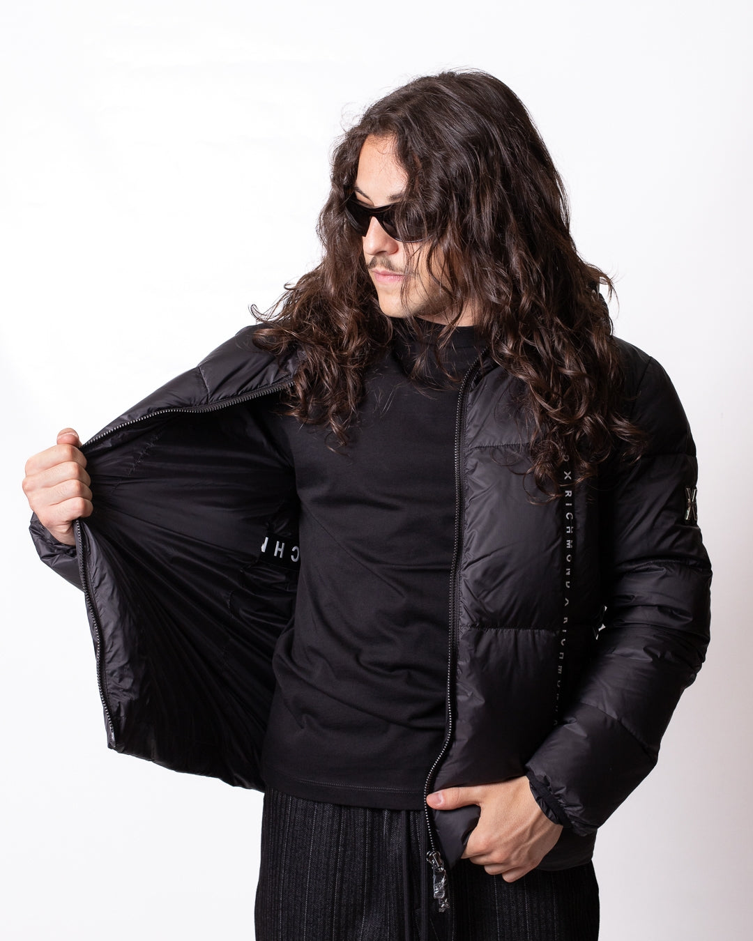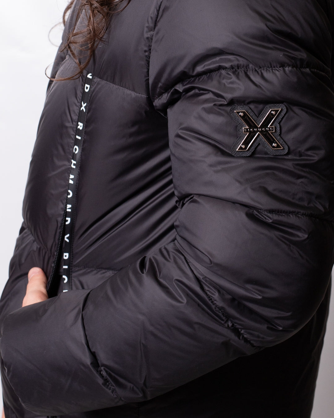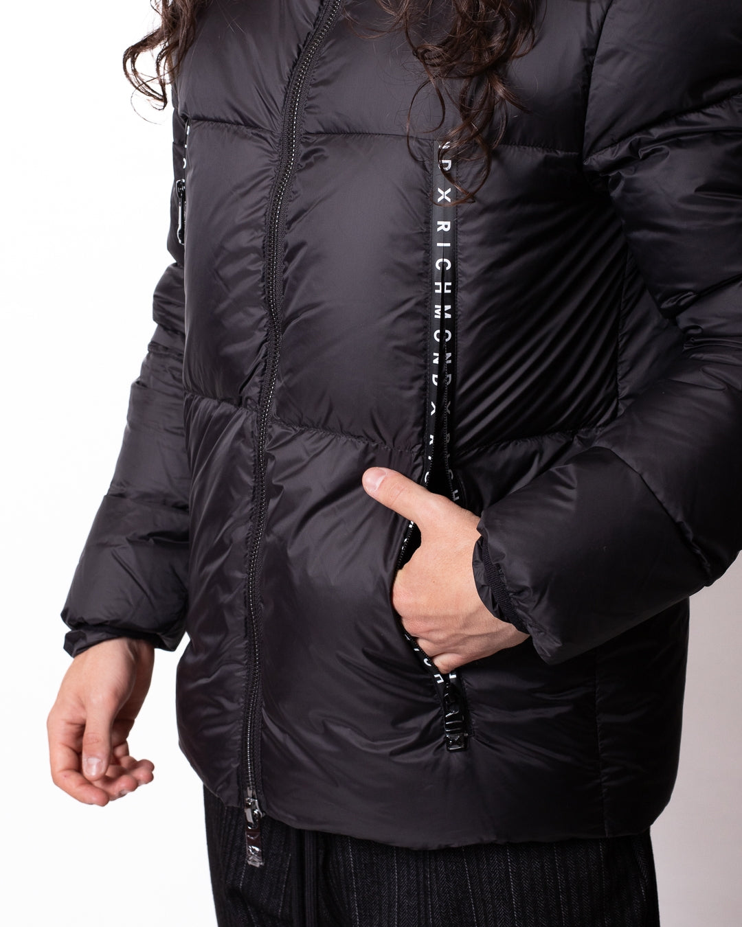 Piumino Richmond X nero, unica variante. Cappuccio con coulisse di regolazione, maniche lunghe, chiusura frontale con zip, tasche laterali con zip, polsini elasticizzati, placca logata in metallo applicata sulla manica e logo stampato sulle tasche e sul cappuccio.