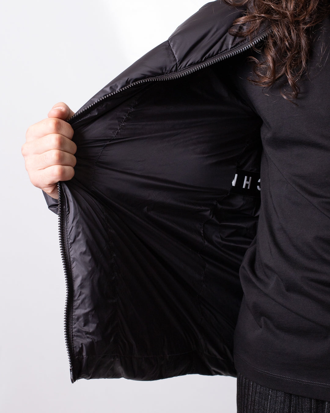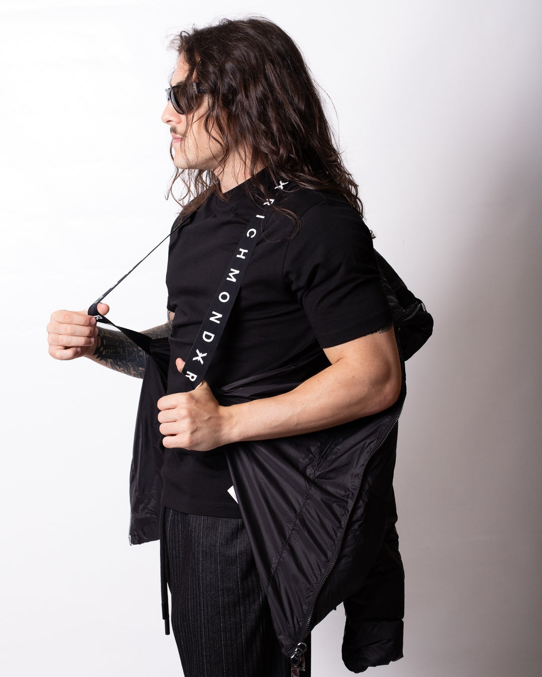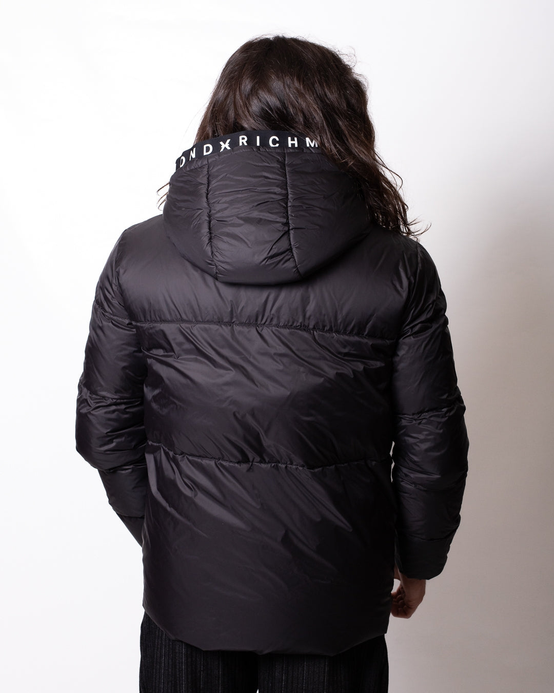 Piumino Richmond X nero, unica variante. Cappuccio con coulisse di regolazione, maniche lunghe, chiusura frontale con zip, tasche laterali con zip, polsini elasticizzati, placca logata in metallo applicata sulla manica e logo stampato sulle tasche e sul cappuccio.