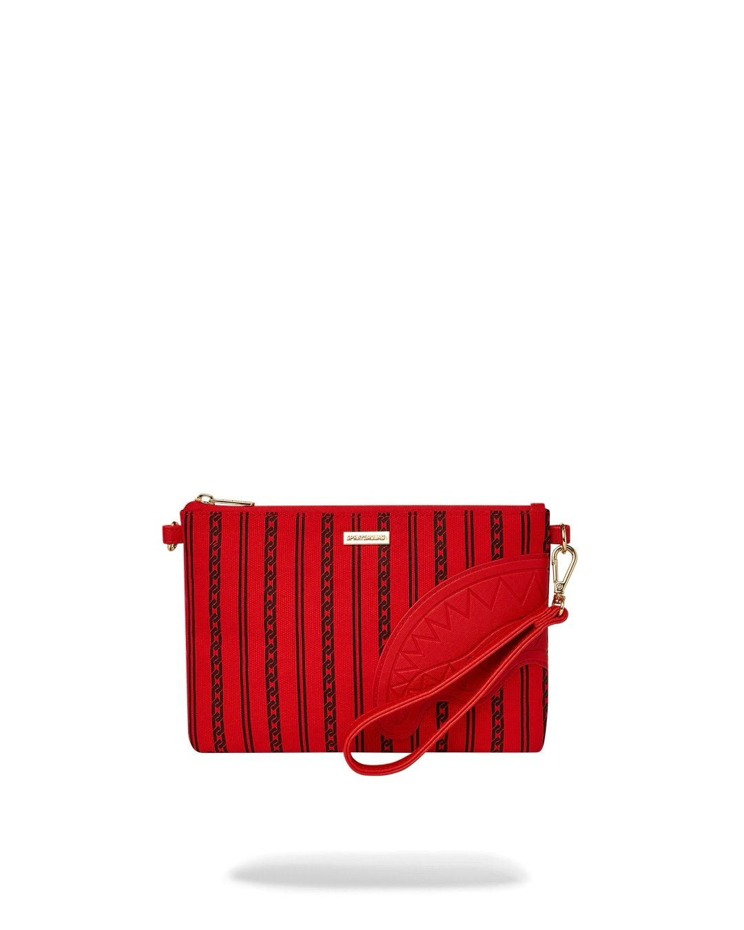 Pochette Sprayground rosso, rappresenta la grafica "reverse sip 2.0 clutch con tracolla". Realizzato in tessuto ed eco-pelle resistente e durevole presenta unico scomparto con chiusura zip logata, cinturino da polso rimovibile, tracolla regolabile e rimovibile e maniglia sul pannello posteriore.