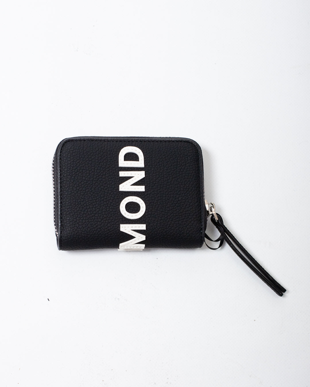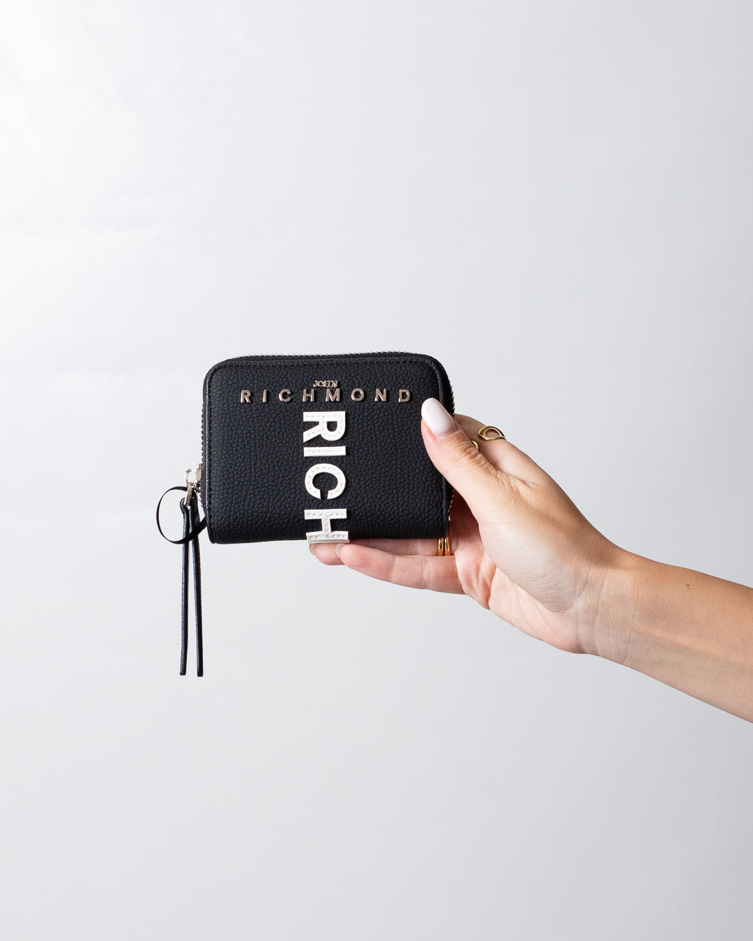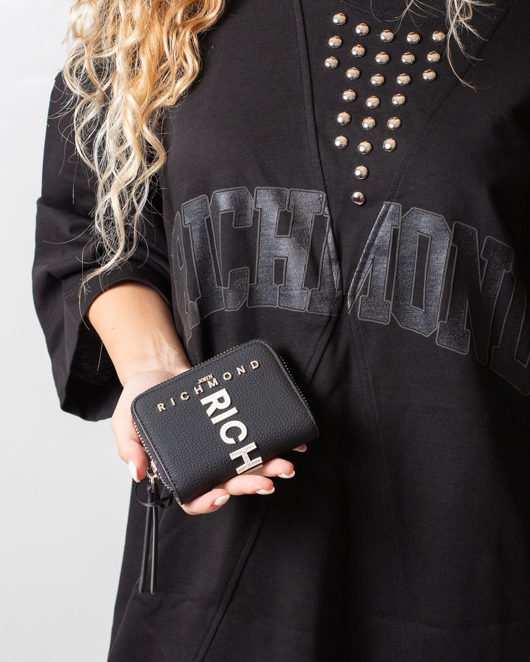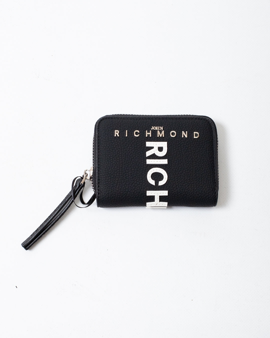 Portafogli John Richmond nero, unica variante. Design in ecopelle, chiusura superiore con zip, logo patch applicato sul davanti e sul retro e placchetta in metallo logata applicata frontalmente.