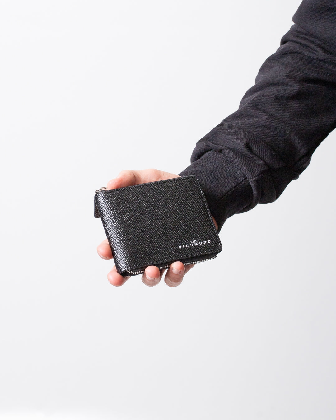 Portafogli John Richmond nero, unica variante. Design in pelle, chiusura con zip a giro, tasche portacarte applicate internamente, tasche a soffietto applicate internamente, logo stampato a contrasto frontalmente ed inciso all'interno.