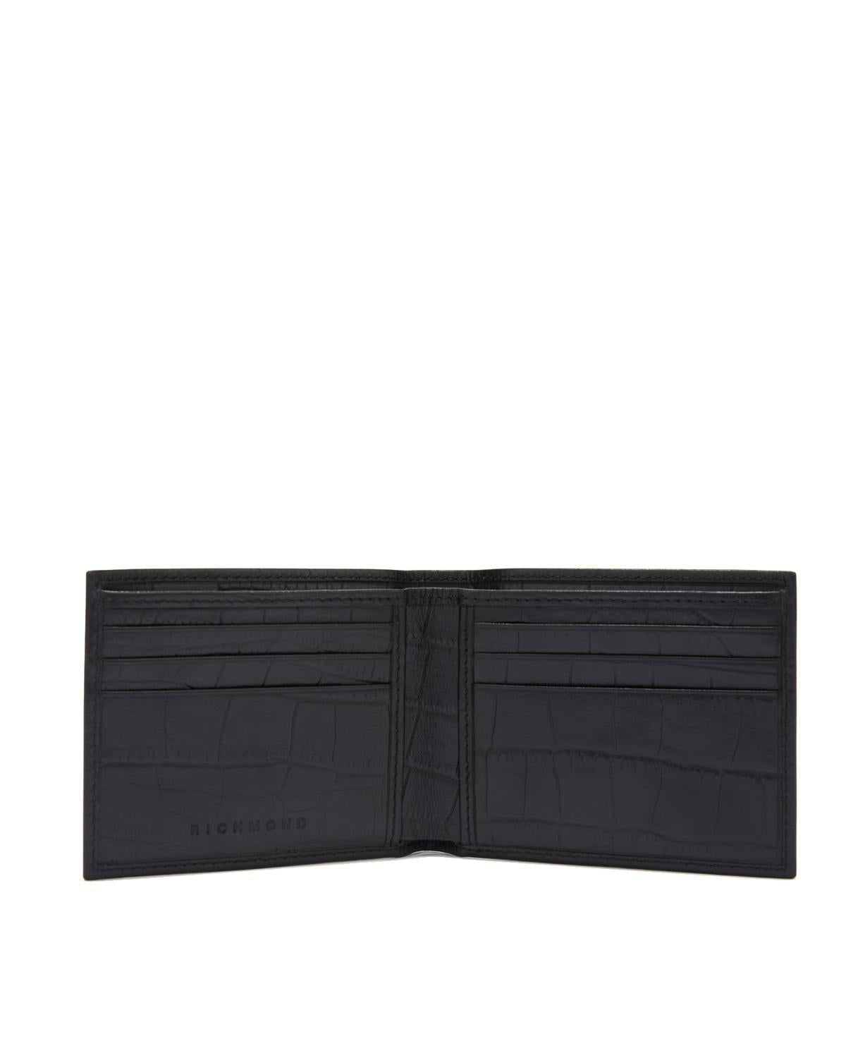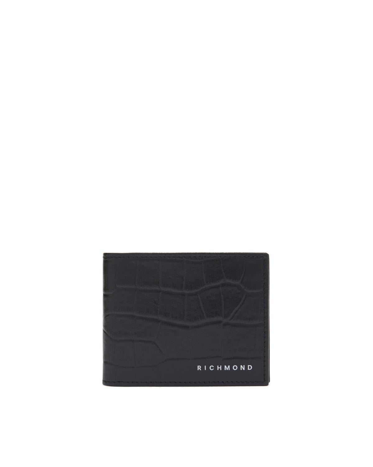 Portafogli John Richmond nero, unica variante. Design in pelle pitonata, tasche portacarte applicate internamente, tasche a soffietto applicate internamente, tasca con bottone applicata intrnamente, logo stampato a contrasto frontalmente ed inciso all'interno.