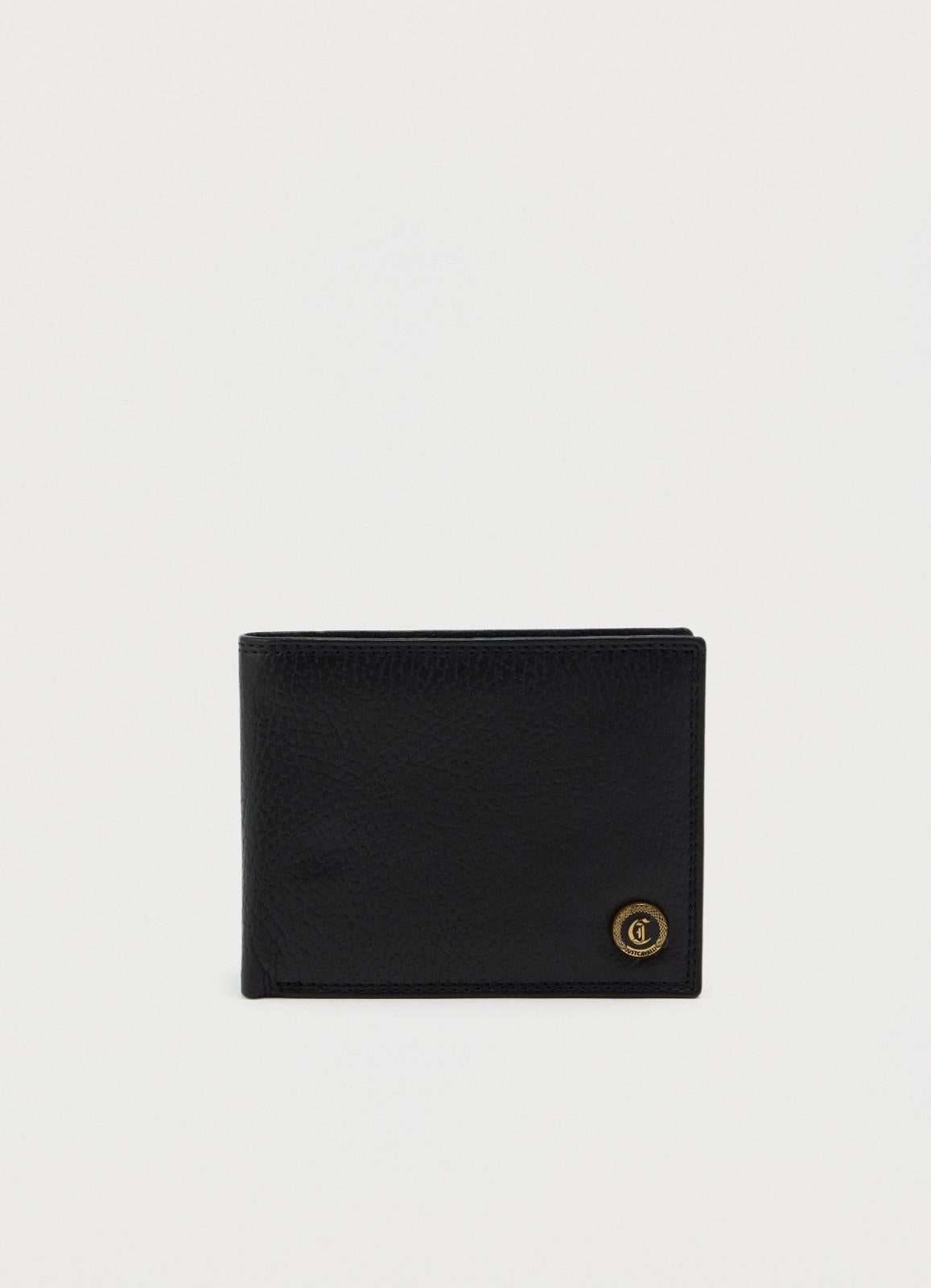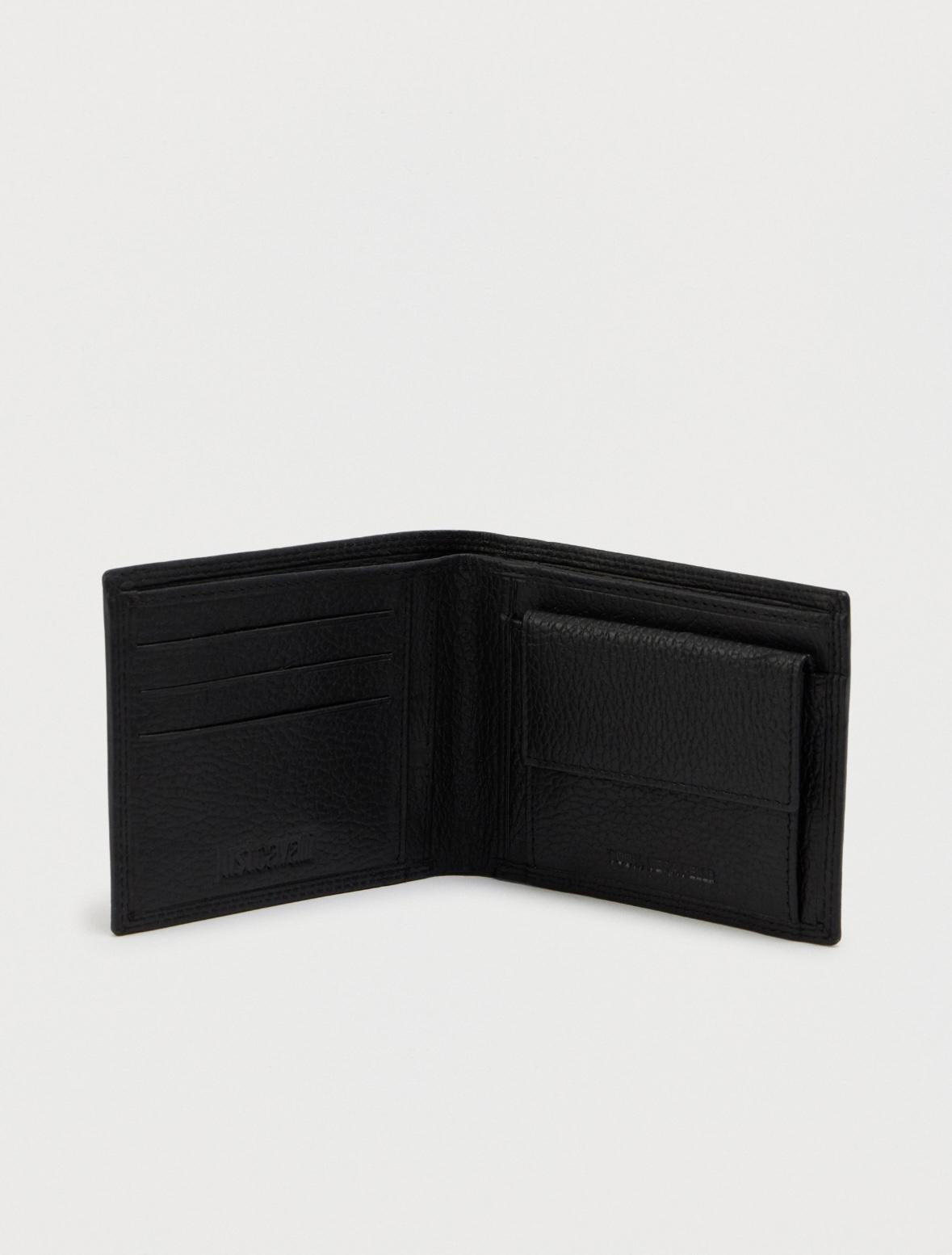 Portafoglio Just Cavalli nero, unica variante. Design in pelle granulata, placchetta logata in metallo applicata sul fondo. Tasche a soffietto, tasche portacarte e tasca con bottone applicate internamente.