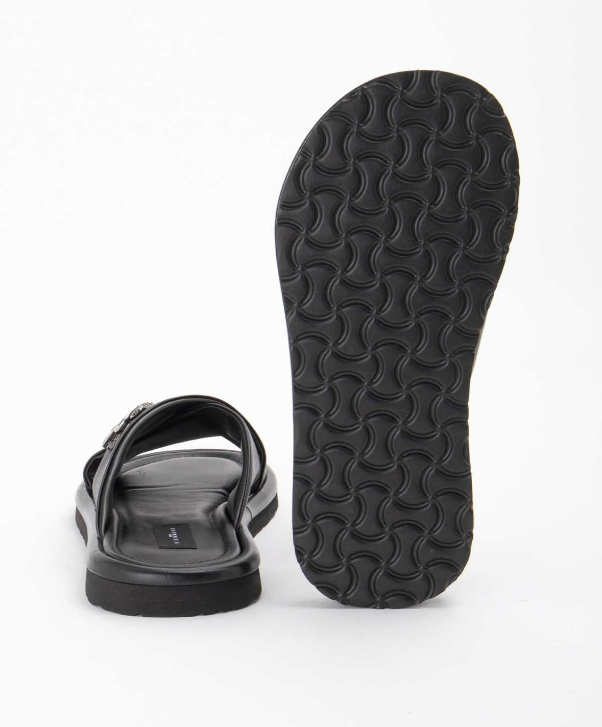 Sandalo John Richmond nero, unica variante. Design in pelle punta tonda aperta, fascia superiore incrociata, soletta interna logata e fibbia metallica con logo JR e serpente applicata sulla fascia.