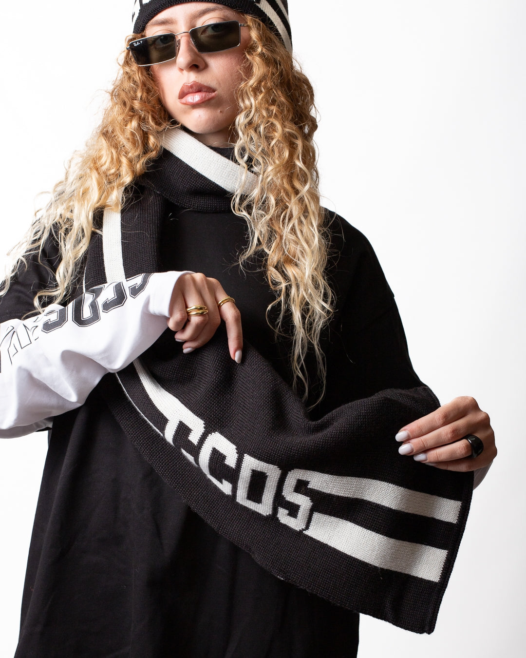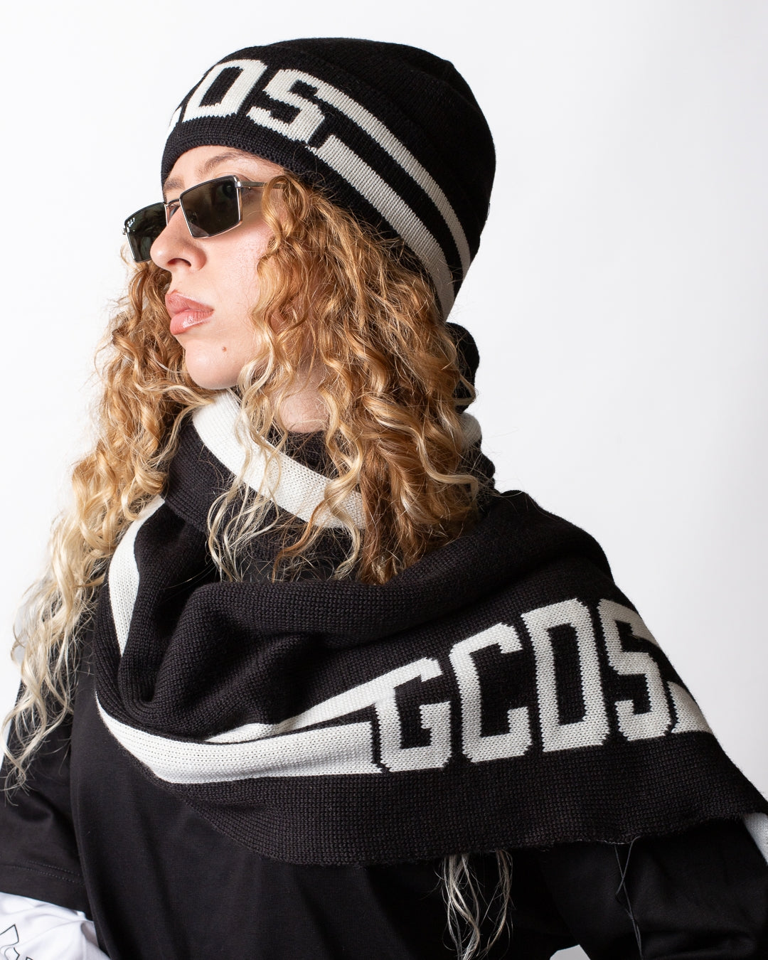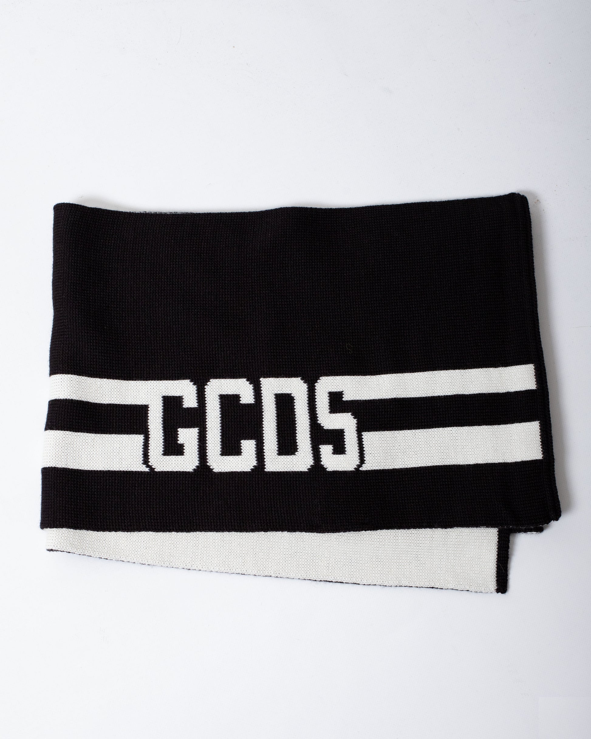 Sciarpa GCDS nera, unica variante. Design in misto lana e logo band applicato a contrasto frontalmente.