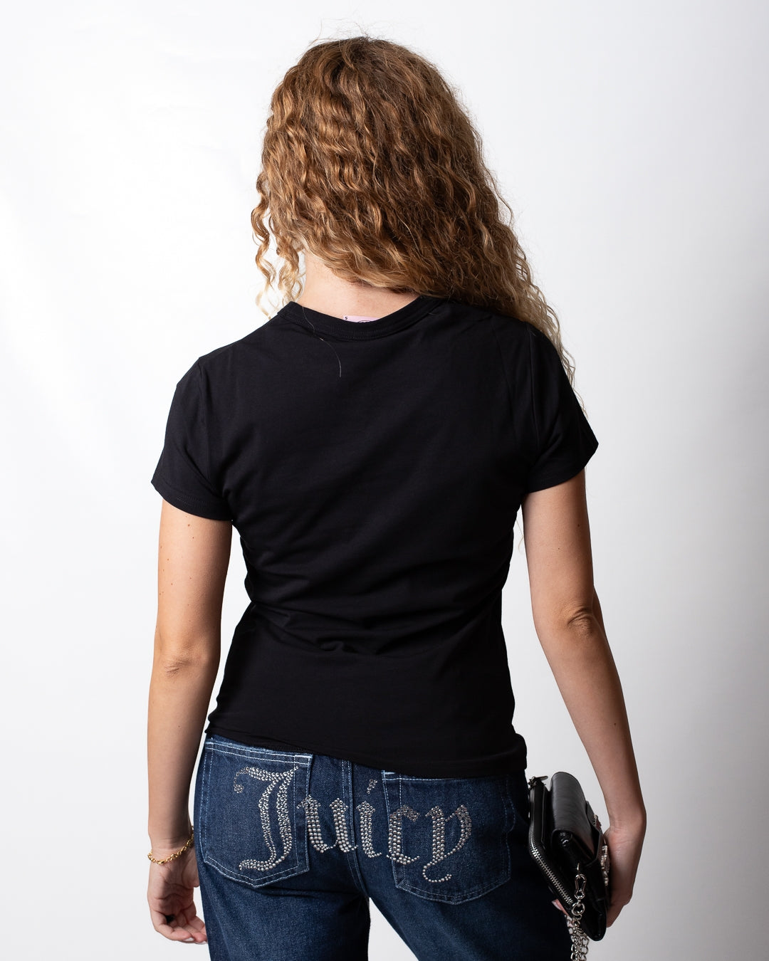 T-Shirt Juicy Couture nera, unica variante. Vestibilità regular, girocollo, maniche corte, collo in costina e stampa "Dog Crest" logata con strass applicata sul davanti.