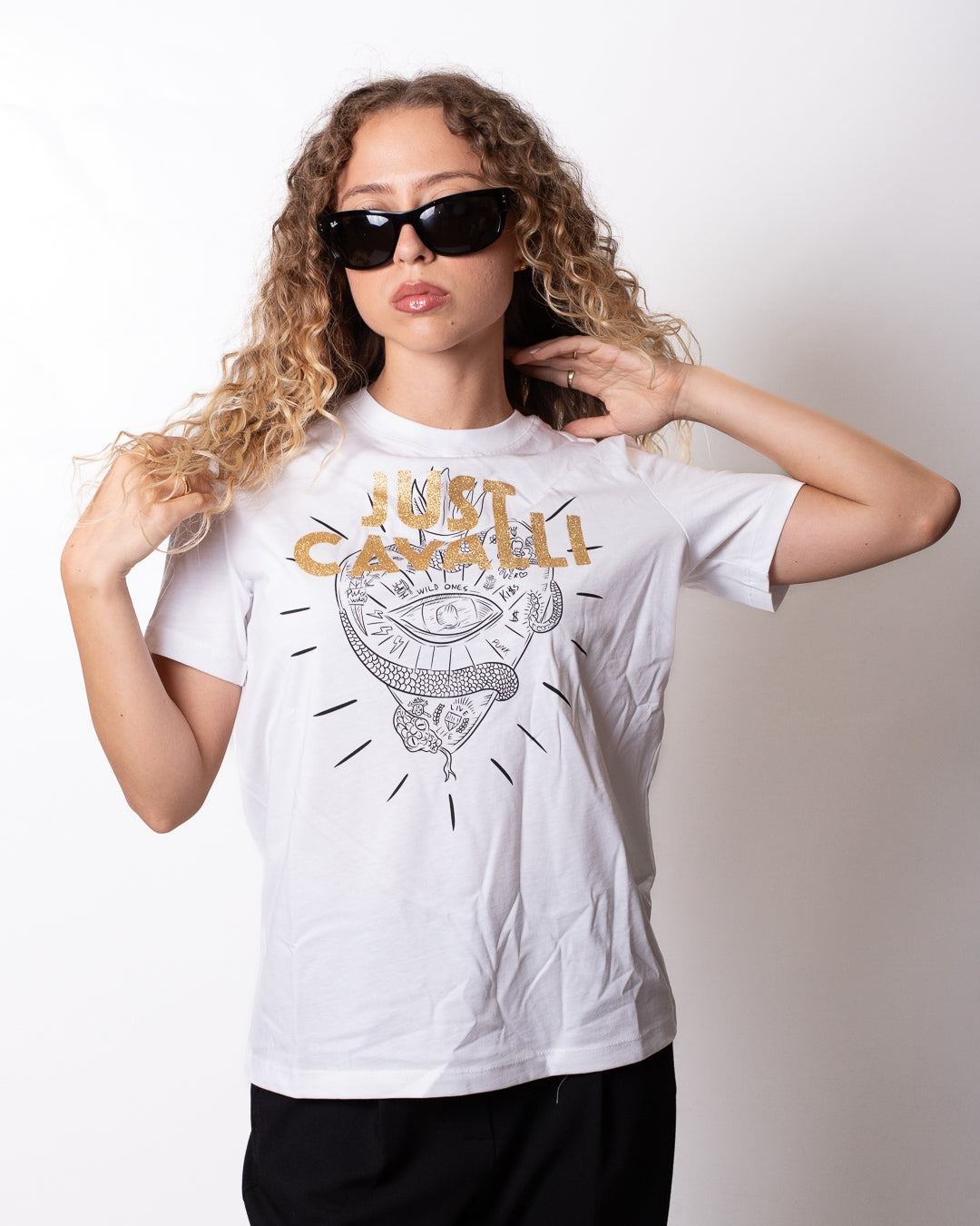 T-Shirt Just Cavalli bianca, unica variante. Girocollo, vestibilità regular, maniche corte, fondo dritto, collo in costina, etichetta logata applicata lateralmente e stampa "Heart Tatoo" con logo Just Cavalli glitterato applicata sul petto.