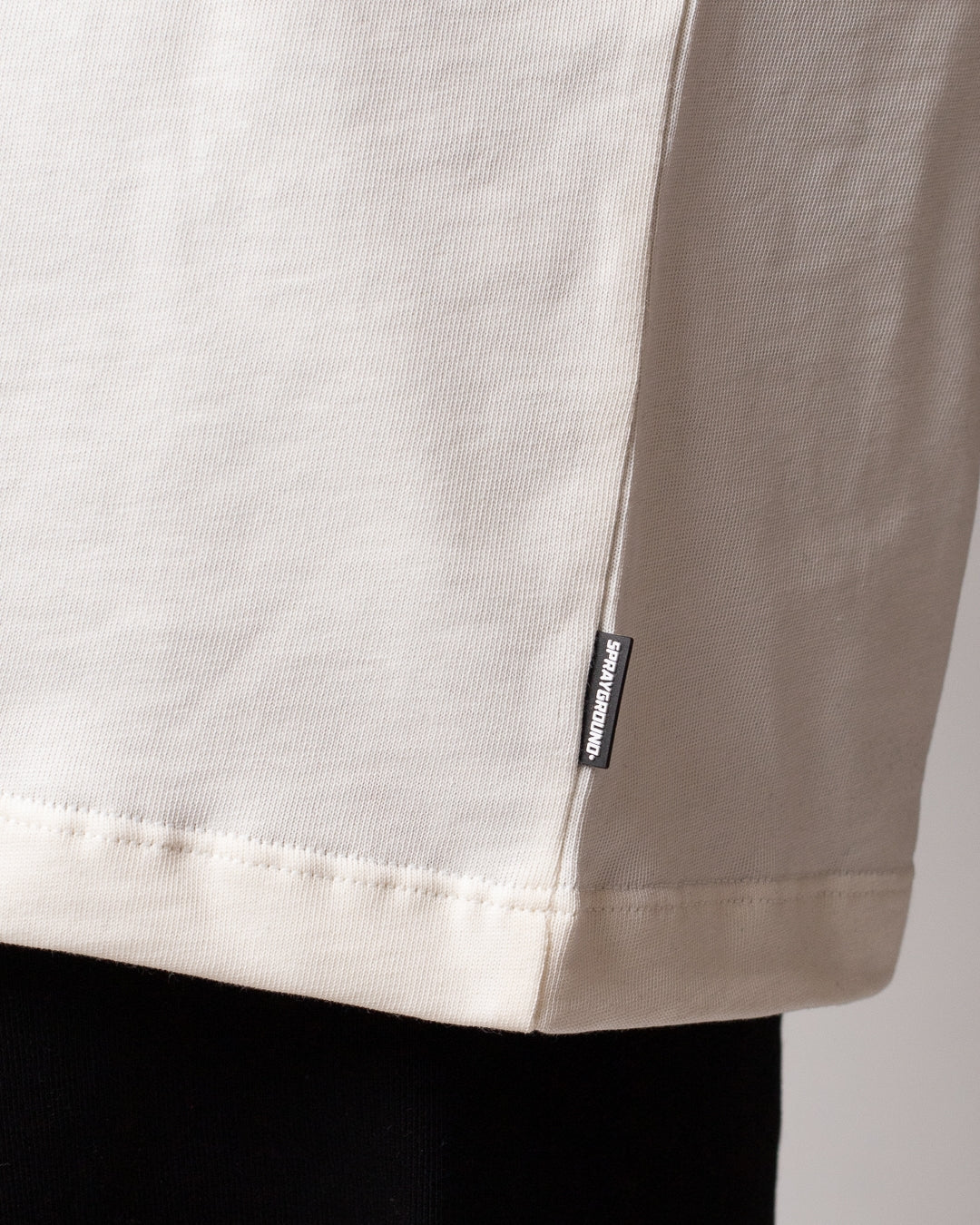 T-Shirt Sprayground avorio, unica variante. Vestibilità regular, girocollo, maniche corte, collo in costina, etichette logate applicate intorno al collo, patch logata sul retro e bocca squalo ricamata sulla manica.