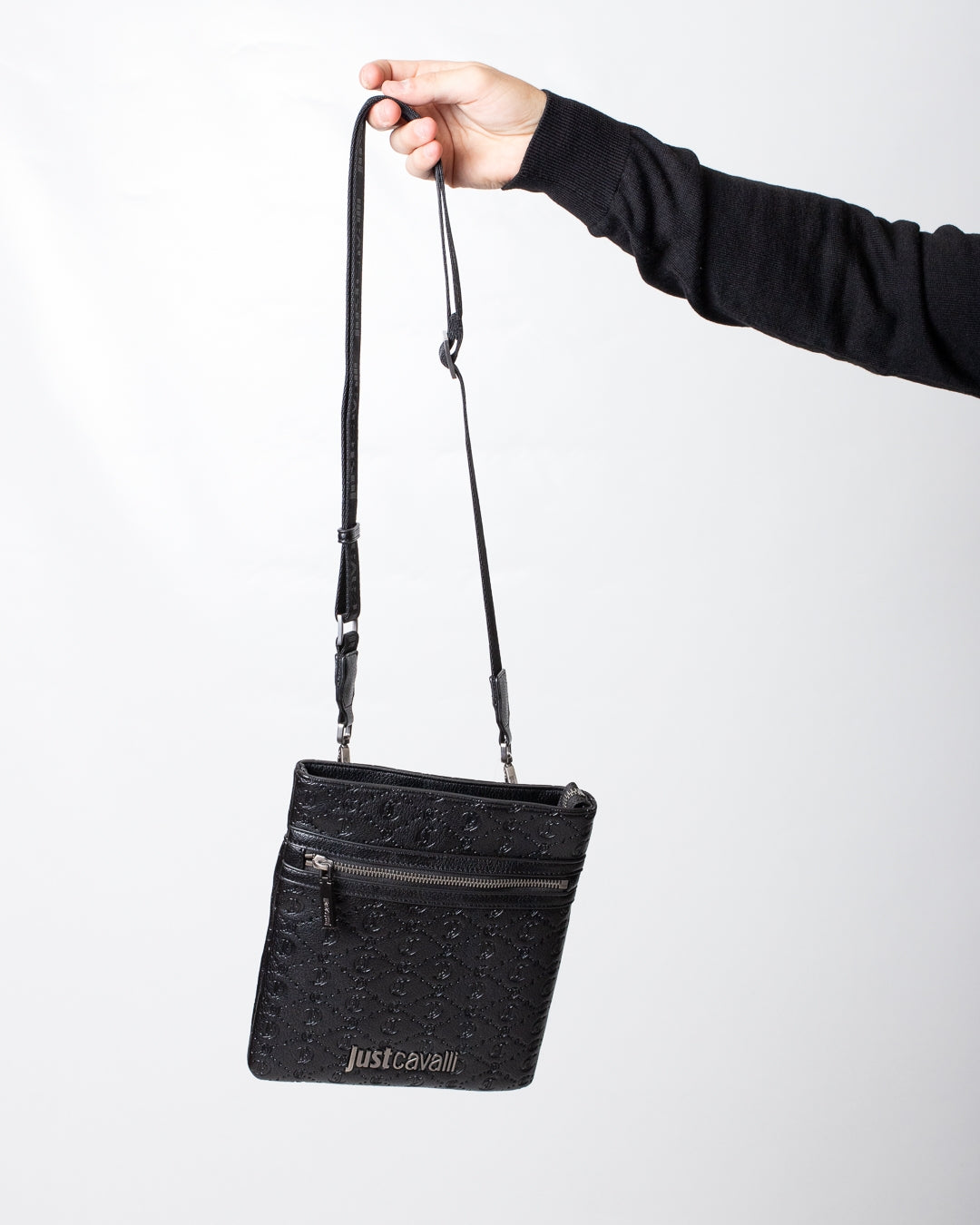 Tracolla Just Cavalli nera, unica variante. Design in pelle, chiusura superiore con zip, tracolla removibile e regolabile, tasca a soffietto sul retro, tasca sul davanti con zip, logo lettering applicato jacquard all-over e placca in metallo logata applicata sul davanti. Internamente: unico scomparto e tasca a soffietto.