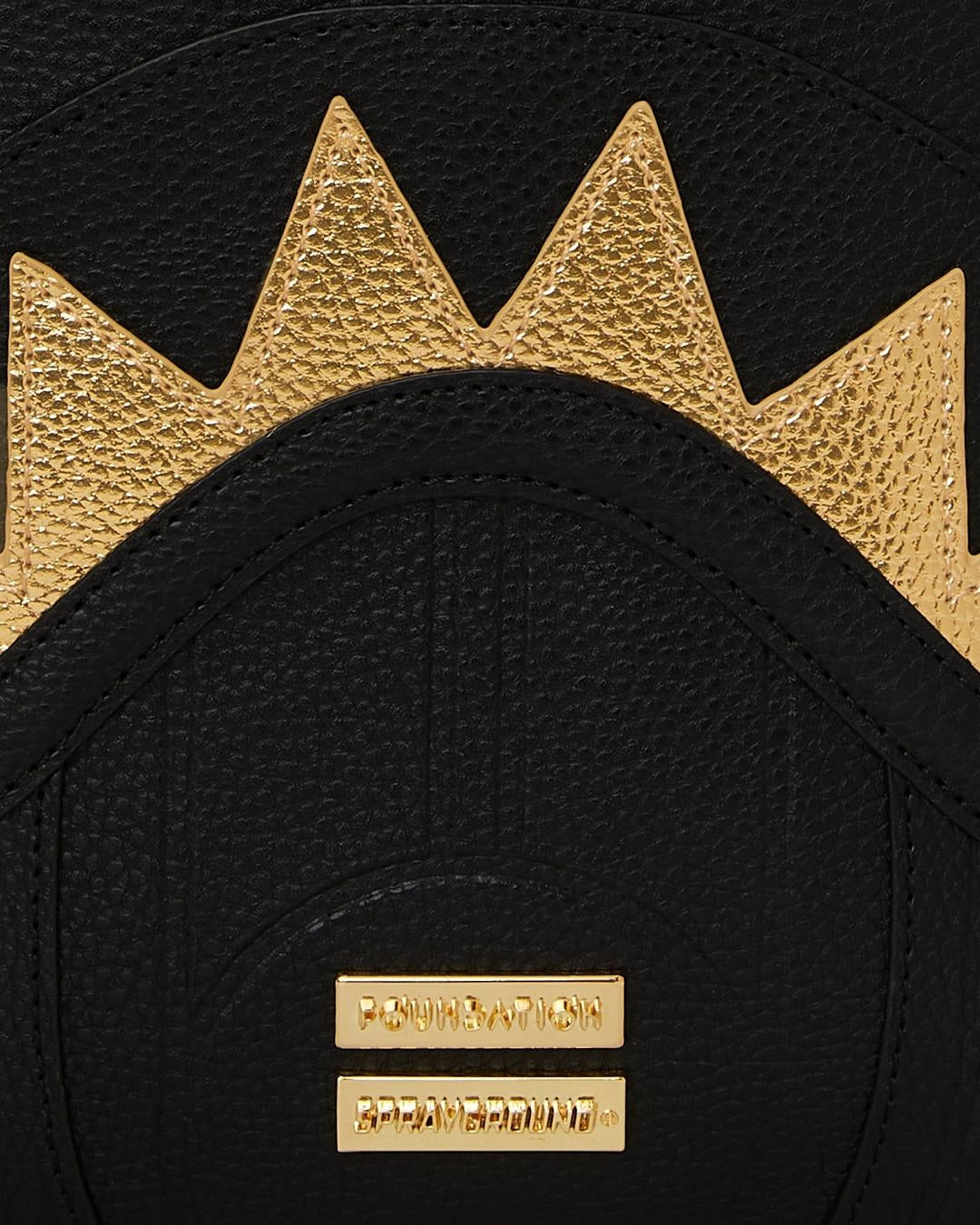 Zaino Sprayground nero, rappresenta la grafica "FOUNDATION FIT FOR KING BACKPACK". Realizzato in eco-pelle resistente e durevole presenta tasca frontale con zip logata, tasche laterali e tasca superiore separata portaocchiali in velour con cerniera logata. Sul retro scomparto con imbottitura ergonomica in rete, tasca nascosta con zip, cinghie regolabili per ogni tipo di taglia e manicotto posteriore per collegare il bagaglio a mano. Manico superiore con placca "Sprayground Authentic" in metallo.