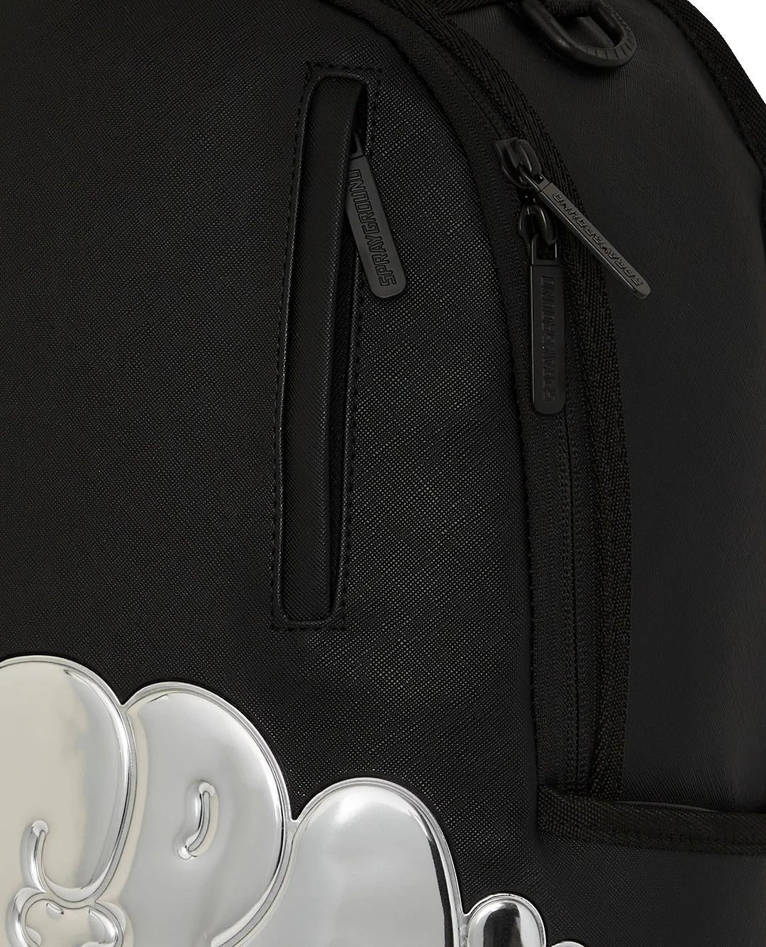 Zaino Sprayground nero, rappresenta la grafica "Metallic drip shark bubbles letters dlx backpack". Realizzato in eco-pelle resistente e durevole presenta tasca frontale con zip logata, tasche laterali e tasca superiore separata portaocchiali in velour con cerniera logata. Sul retro scomparto con imbottitura ergonomica in rete, tasca nascosta con zip,  cinghie regolabili per ogni tipo di taglia e manicotto posteriore per collegare il bagaglio a mano. Manico superiore con placca "Sprayground Authentic" in metallo.