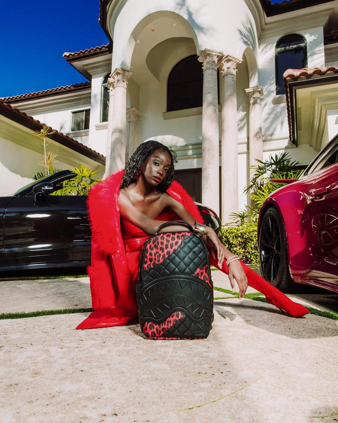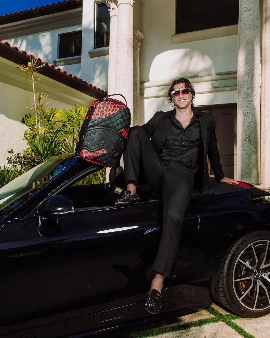 Zaino Sprayground nero, rappresenta la grafica " Red Leopard puffer dlx backpack". Realizzato in eco-pelle resistente e durevole presenta tasca frontale con zip logata, tasche laterali e tasca superiore separata portaocchiali in velour con cerniera logata. Sul retro scomparto con imbottitura ergonomica in rete, tasca nascosta con zip,  cinghie regolabili per ogni tipo di taglia e manicotto posteriore per collegare il bagaglio a mano. Manico superiore con placca "Sprayground Authentic" in metallo.
