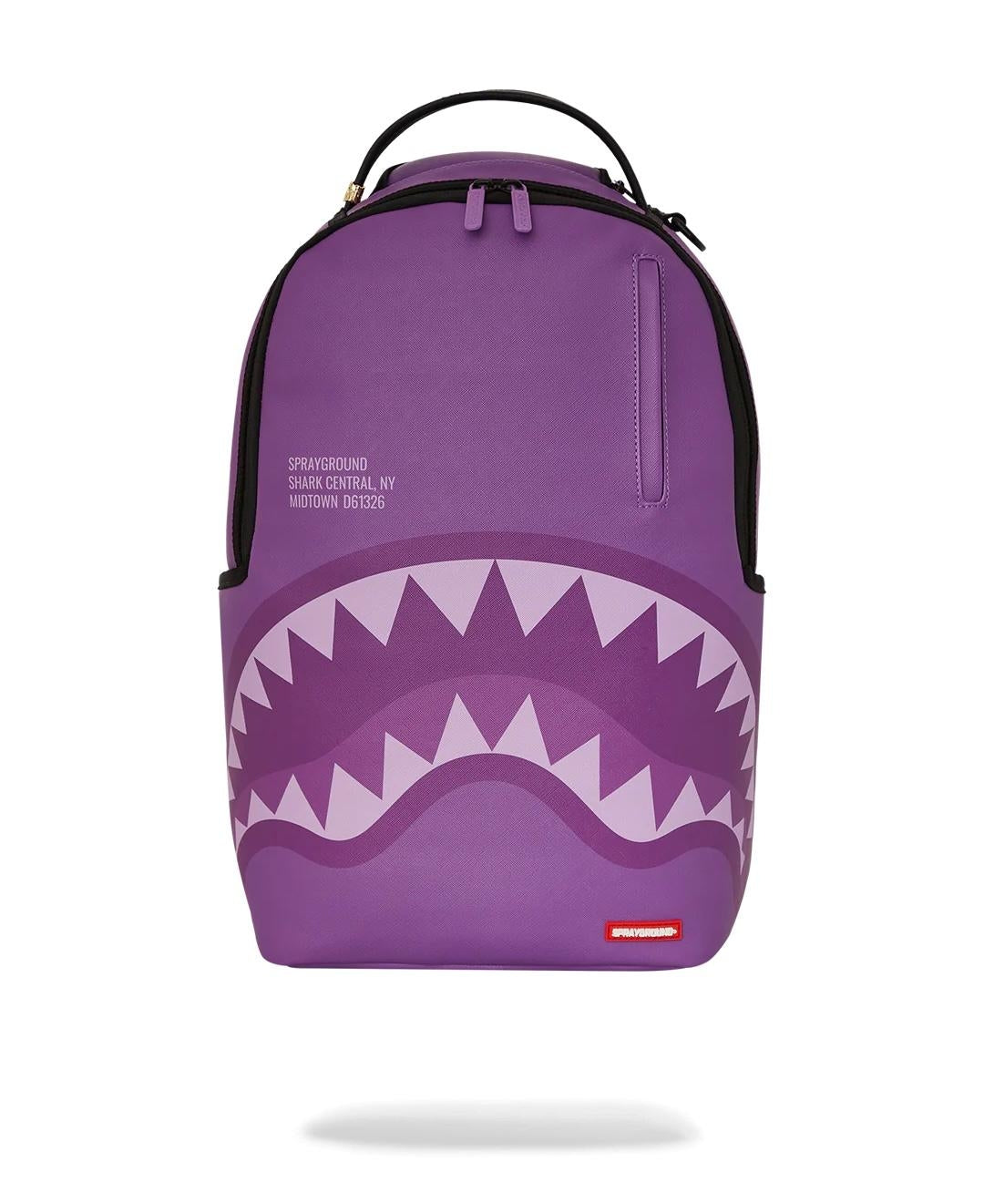 Zaino Sprayground viola, rappresenta la grafica " Purple shark central dlxsv backpack". Realizzato in eco-pelle resistente e durevole presenta tasca frontale con zip logata, tasche laterali e tasca superiore separata portaocchiali in velour con cerniera logata. Sul retro scomparto con imbottitura ergonomica in rete, tasca nascosta con zip,  cinghie regolabili per ogni tipo di taglia e manicotto posteriore per collegare il bagaglio a mano. Manico superiore con placca "Sprayground Authentic" in metallo.